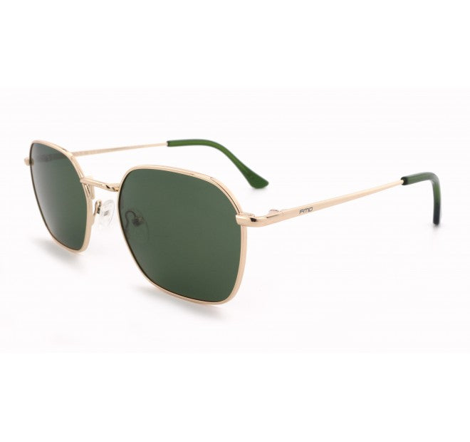 GAFA DE SOL EN METAL CON FORMA IRREGULAR EN COLOR DORADO CON LA LENTE EN VERDE.