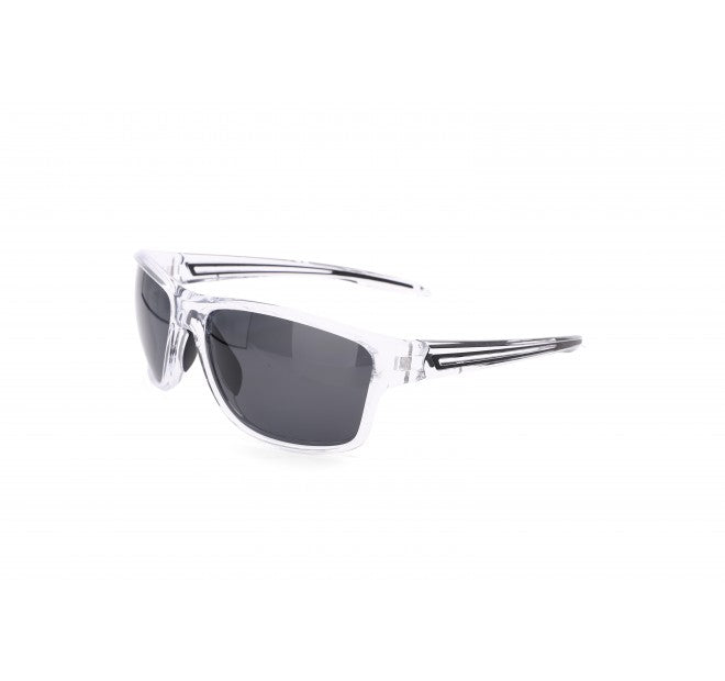 GAFA DE SOL DEPORTIVA EN COLOR TRANSPARENTE CON LAS LENTES EN NEGRO POLARIZADAS.