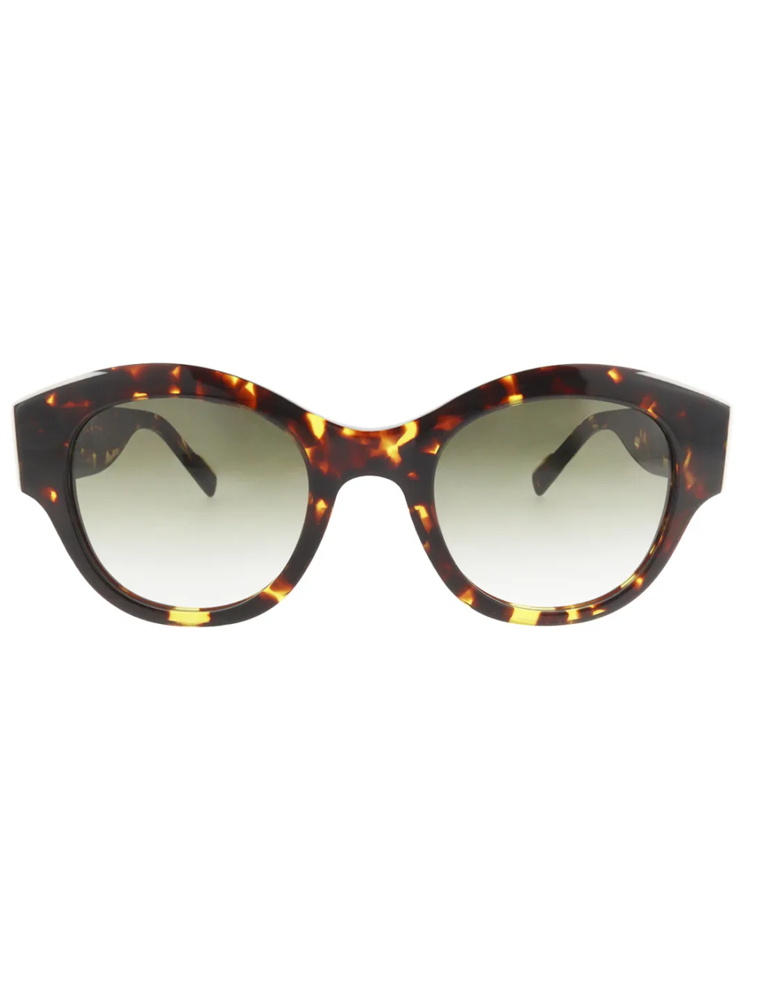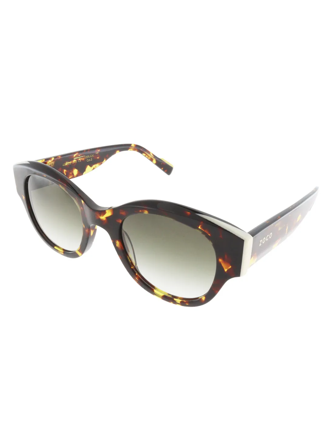 Gafas de sol para mujer, redonda, con ligera curvatura que la acerca a la forma de antifaz, con juego de color en la esquina del frontal y varilla ancha que se va acortando en la patilla.