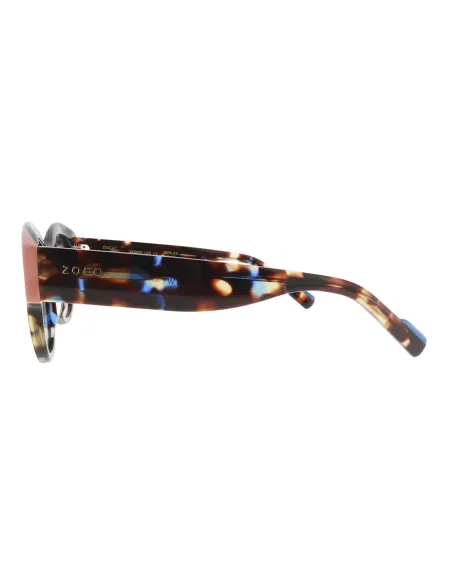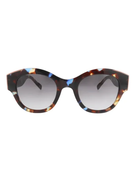 Gafas de sol para mujer, redonda, con ligera curvatura que la acerca a la forma de antifaz, con juego de color en la esquina del frontal y varilla ancha que se va acortando en la patilla.
